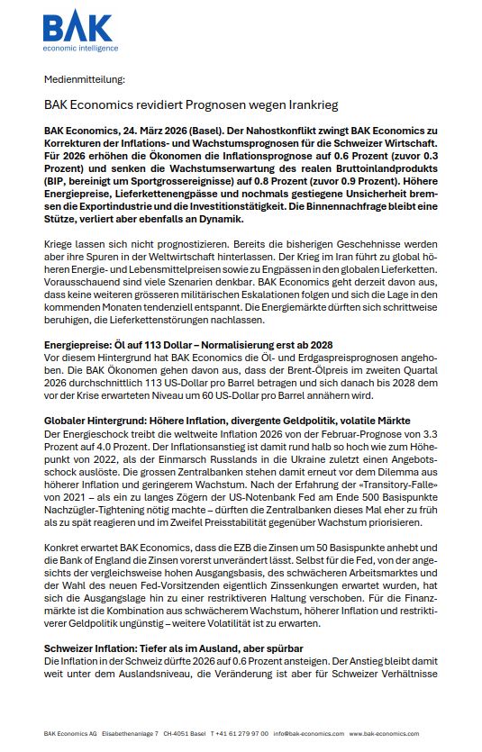 Der Nahostkonflikt zwingt BAK Economics zu Korrekturen der Inflations- und Wachstumsprognosen für die Schweizer Wirtschaft. Für 2026 erhöhen die Ökonomen die Inflationsprognose auf 0.6 Prozent (zuvor 0.3 Prozent) und senken die Wachstumserwartung des realen Bruttoinlandprodukts (BIP, bereinigt um Sportgrossereignisse) auf 0.8 Prozent (zuvor 0.9 Prozent). Höhere Energiepreise, Lieferkettenengpässe und nochmals gestiegene Unsicherheit bremsen die Exportindustrie und die Investitionstätigkeit. Die Binnennachfrage bleibt eine Stütze, verliert aber ebenfalls an Dynamik.