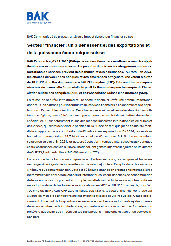 BAK Communiqué de presse : analyse d’impact du secteur financier suisse