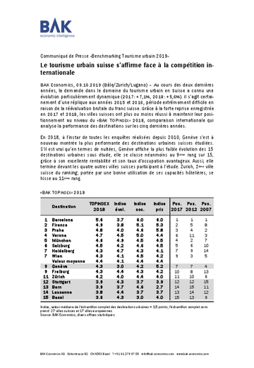 BAK Communiqué de presse: «Benchmarking tourisme urbain 2019»